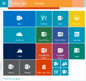 To begin customizing your apps, just click on the apps launcher on the Office 365 Taskbar at the top of your browser window. The app launcher can also be opened from any Office 365 program because the Office 365 Taskbar remains open on every page.
