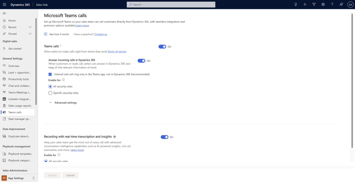 If your organization has Teams licenses with a phone system set up, you will be able to configure the Teams dialer in D365 Sales. An administrator will need to go into the App settings and select Teams calls under General settings. Turning this on will prompt some setup options, like allowing incoming calls to be answered in D365 and also set internal organization calls to come in only through the Teams client (not in D365).